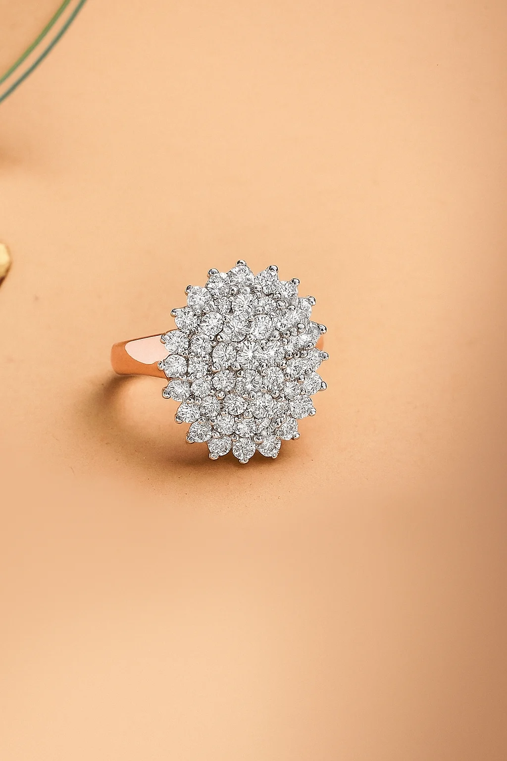 Turn every moment into an occasion with this Radiant Diamond Cluster Ring, a true masterpiece of luxury and craftsmanship. Set in warm rose gold, this ring features a breathtaking arrangement of round-cut diamonds, meticulously placed to create a captivating cluster that shines from every angle.